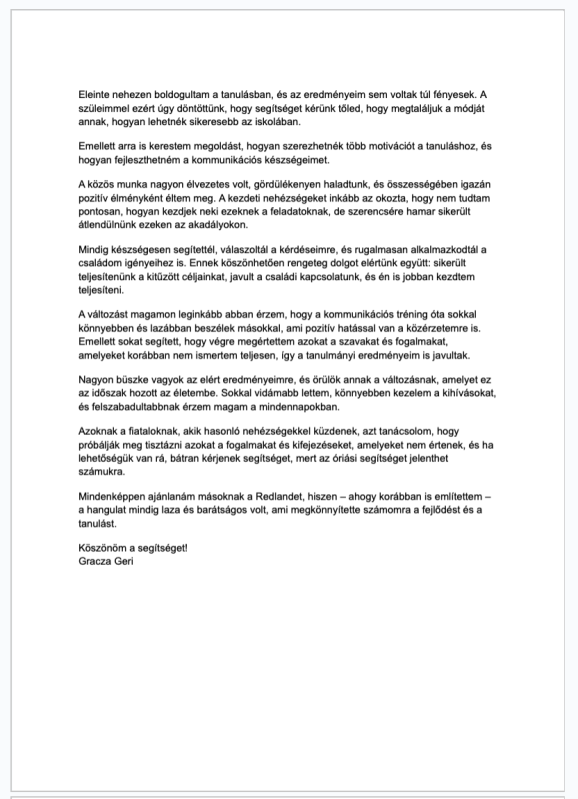 Korábban nehezen boldogult a tanulásban, nem volt motivációja és az önbizalma is hiányzott. A Redland mentorálás során megtanult tanulni, fejlődött a kommunikációja, javult a családi kapcsolata, és vidámabb, magabiztosabb lett. Ma már könnyedén beszél másokkal, sokkal jobb tanulmányi eredményeket ér el és gőz erővel halad a célja felé. — Gracza Geri